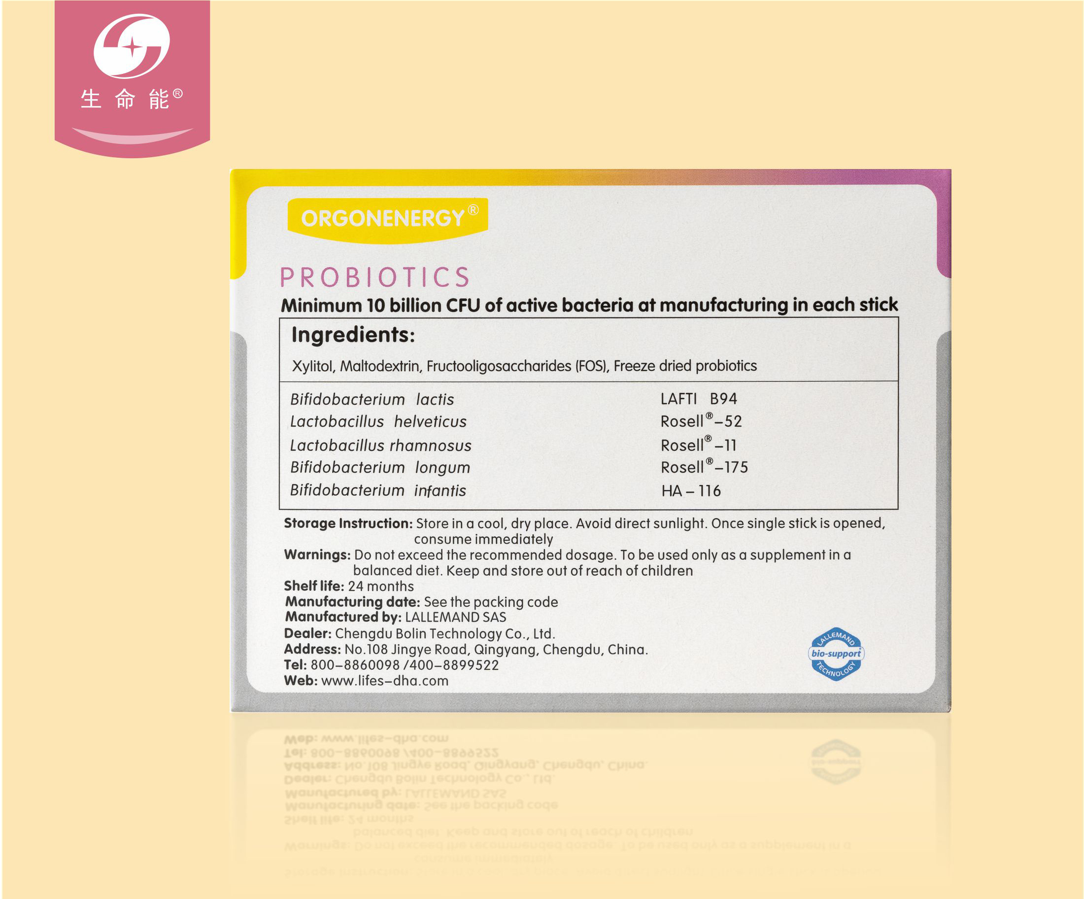 【配料】:麦芽糊精、低聚果糖、木糖醇、益生菌(乳双歧杆菌LAFTI®B94、瑞士乳杆菌Rosell®-52、鼠李糖乳杆菌Rosell®-11、上双歧杆菌Rosell®-175、婴儿双歧杆菌Rosell®-33)